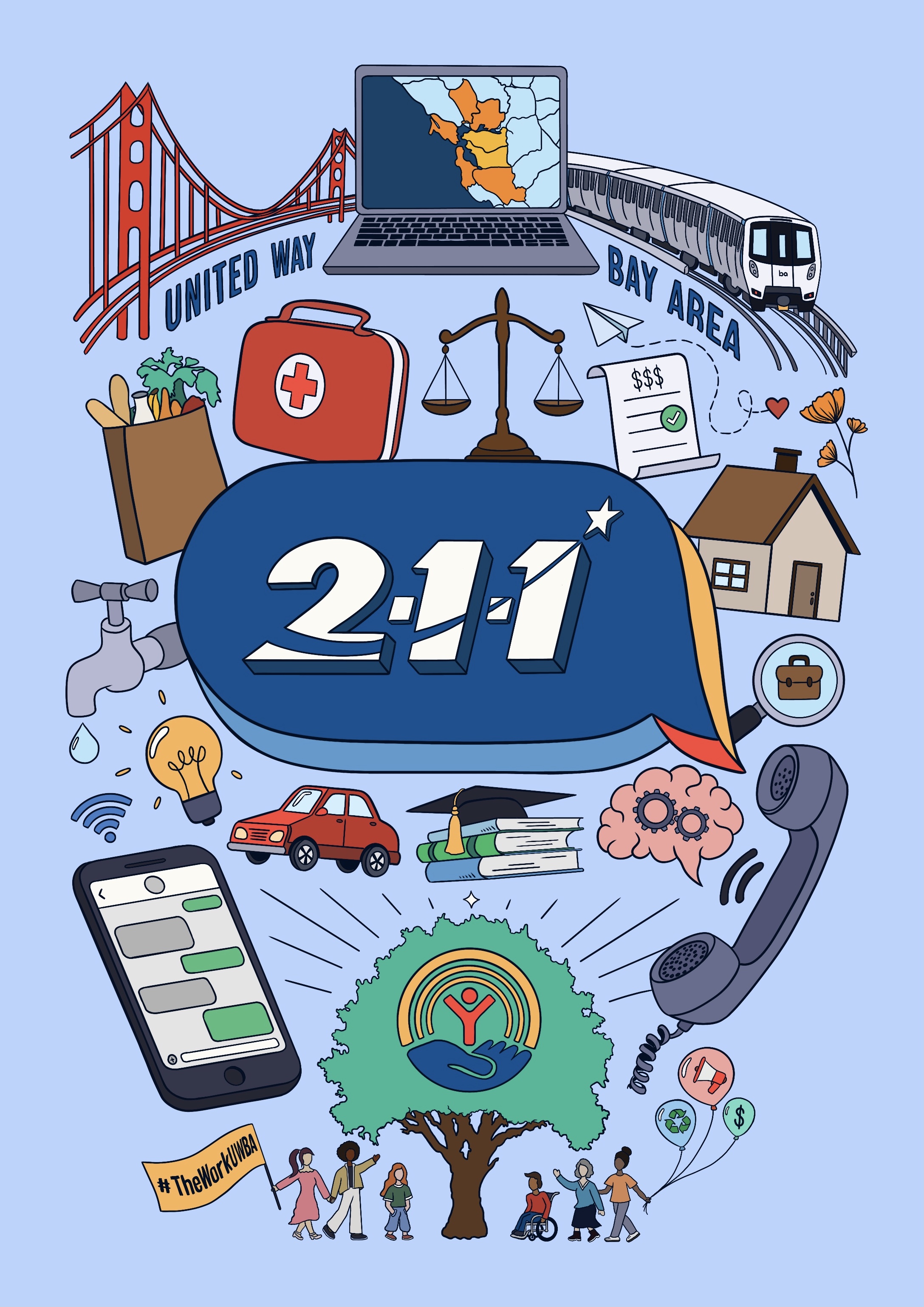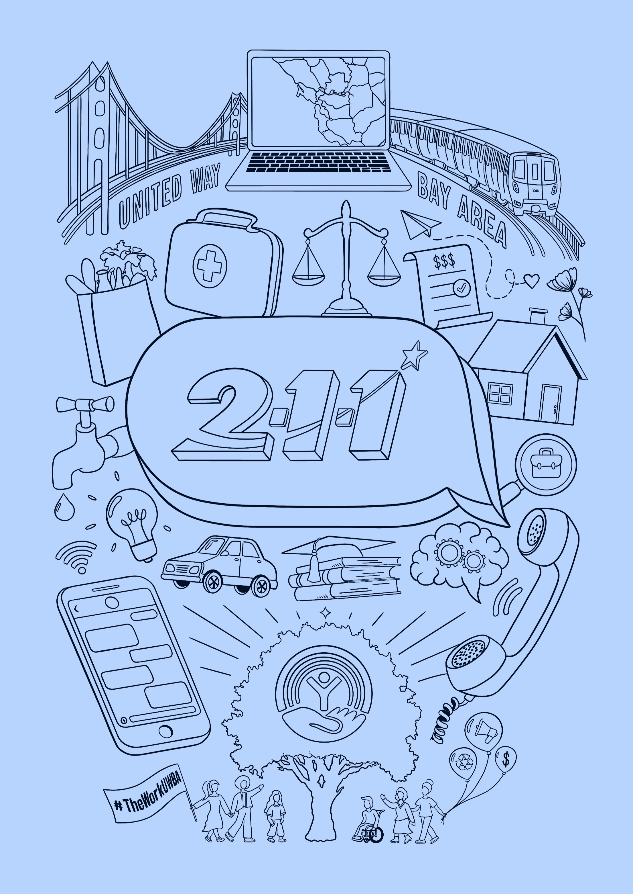 The visual language of my artwork is central to the vital work of 2-1-1 and United Way Bay Area (UWBA). I was inspired by United Way’s 2-1-1 speech balloon logo design and expanded its typography to depict its dynamic impact. Iconography surrounds the main speech bubble to display its provided health and human services (i.e., food, healthcare, disaster relief, legal justice, bills, shelter, employment job search, mental wellness, education, transportation, and utilities). Additionally, I illustrated the different ways to access 2-1-1 services through telephone calls, mobile text messaging, and online resources at 211bayarea.org