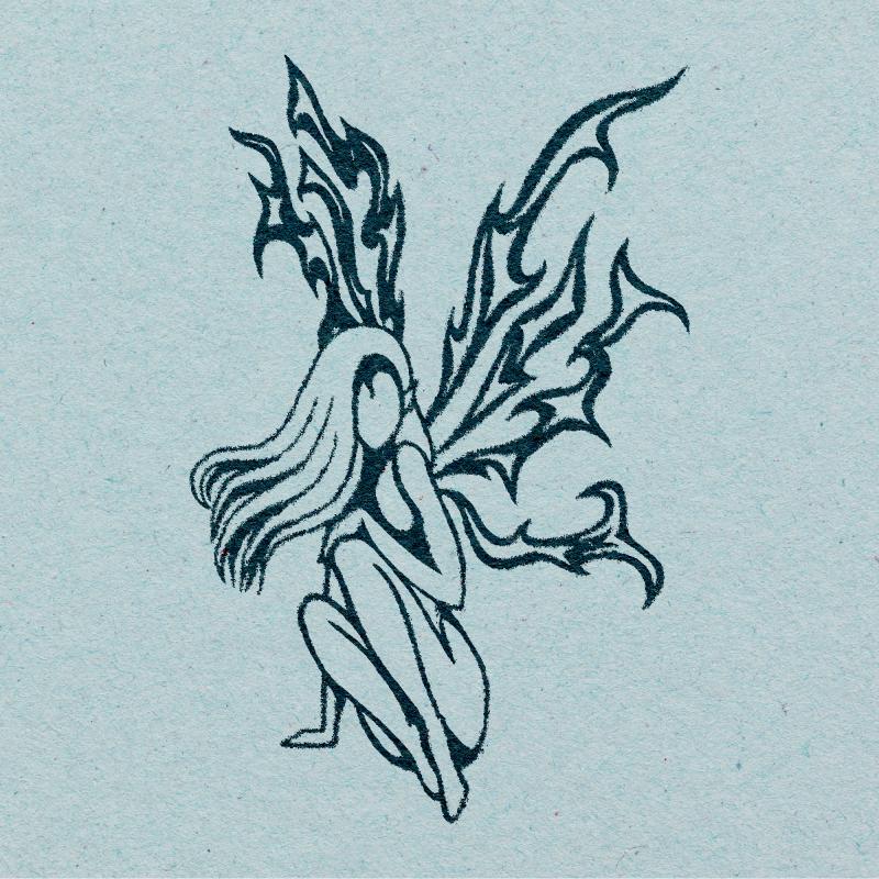 I illustrated a self-portrait/artist logo representing my interests in fairies and spiritualism. The first slide is an ink-bleed variation of the original line drawing shown in the second slide.