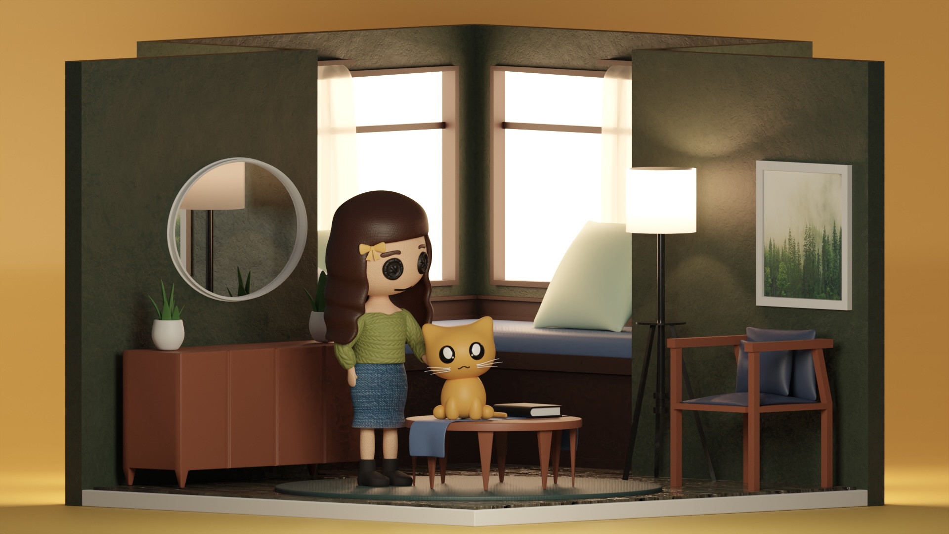 For my first 3D modeling class’s final project, I created an isometric room scene with a character I built over the semester. The doll girl character design is inspired by Lalaloopsy dolls that I used to collect when I was younger. The whole render scene resembles the warm feeling of comfort and serenity at home with a cat and books. All made within Blender.
