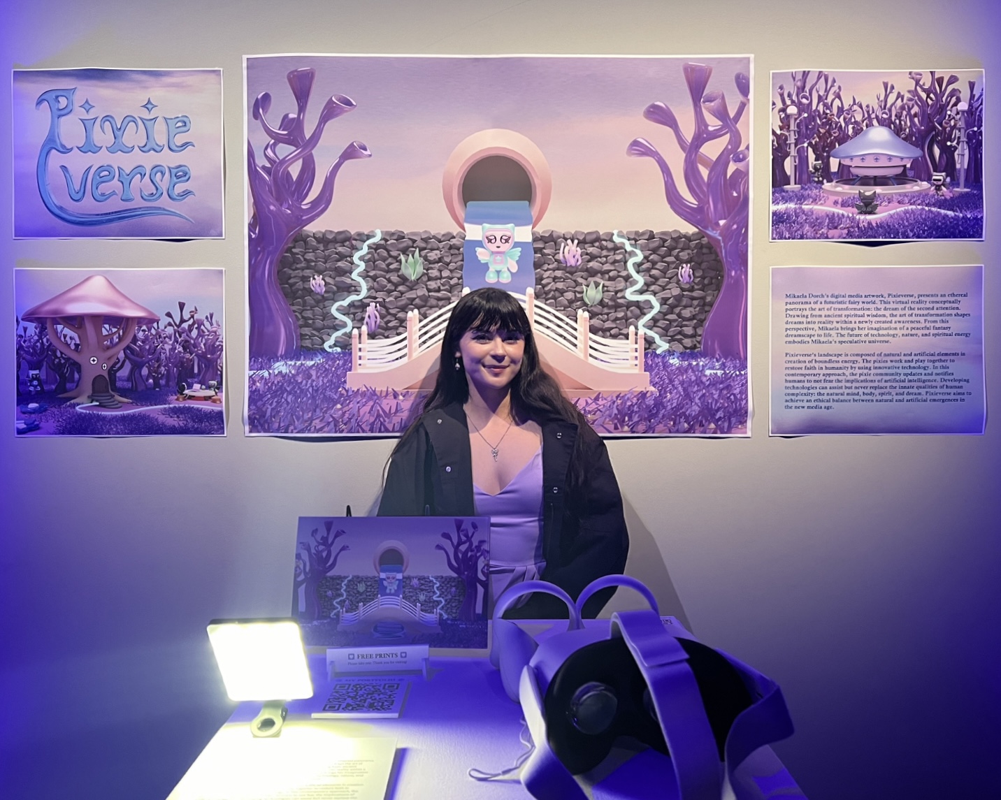 Mikaela Dorch’s digital media artwork, Pixieverse, presents an ethereal panorama of a futuristic fairy world. This virtual reality conceptually portrays the art of transformation: the dream of the second attention. Drawing from ancient spiritual wisdom, the art of transformation shapes dreams into reality within a newly created awareness. From this perspective, Mikaela brings her imagination of a peaceful fantasy dreamscape to life. The future of technology, nature, and spiritual energy embodies Mikaela’s speculative universe.